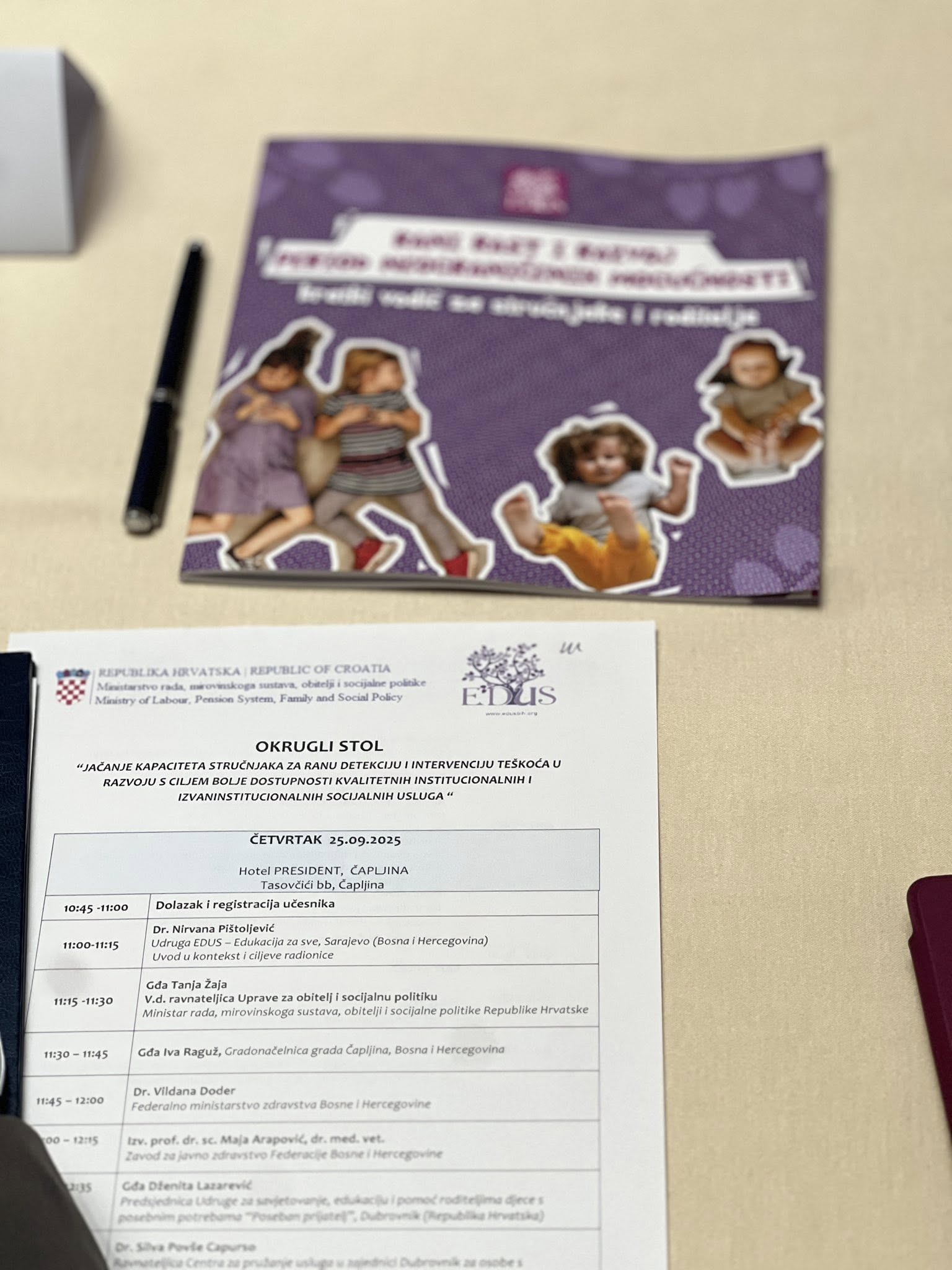 Okrugli stol održan je na temu jačanja kapaciteta stručnjaka za ranu detekciju i intervenciju teškoća u razvoju, s posebnim fokusom na unaprjeđenje dostupnosti kvalitetnih socijalnih usluga, kako institucionalnih tako i izvaninstitucionalnih.